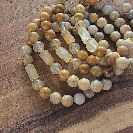 Get ready to soak up some sunshine with this friendly and bright bracelet! This 7" piece is all about warmth, featuring a stunning 12mm barrel-shaped Citrine bead right in the center. Citrine is often called the "Success Stone," and its beautiful golden color really brings the light. We've paired it with smooth, cheerful Coral Jade beads, which provide a beautiful contrast. To give it a touch of delicate sparkle, we've used lovely gold floral disc spacers throughout. This is a must-have piece for brightening up your day, whether you wear it solo or stacked!