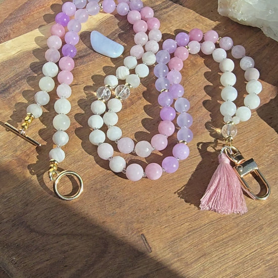 - Focal & Accent Beads: Stunning combination of Moonstone, Kunzite, Morganite, Chalcedony, Grey Agate, Quartz, and complimentary tassel.