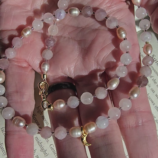 - Focal & Accent Beads: Stunning combination of faceted Rose Quartz, natural Rose Quartz, and Pink Pearls. Focal charm is a delicate 14K Gold tiny crescent moon.