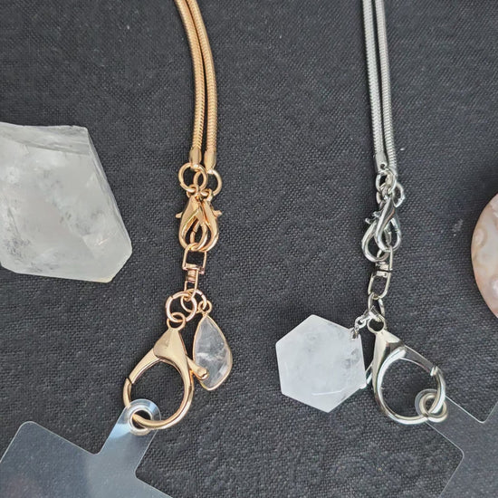 This design offers dual functionality and is grounded by a delicate, yet weighty Natural Clear Quartz or Rose Quartz/Tiger Eye Hexagon connector, adding a subtle, organic focal point to your look. The piece measures a generous 23 inches (from neck to clasp bottom), making it perfect for use as a long lanyard for your ID badge, keys, or for securing your cell phone. Every lanyard includes a Universal Card Gasket to easily convert your piece into an elegant phone strap. The durable metal snake chain is available in your choice of Gold or Silver finish, with the Gold finish featuring a Natural Clear Quartz teardrop, and the Silver finish offering a Natural Clear Quartz hexagon. It is built for all-day comfort, providing a smooth, lightweight feel.