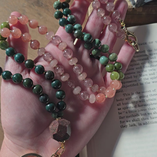 - Focal & Accent Beads: Stunning gradient pattern of natural gemstones: India Agate focal bead, Sunstone, Strawberry Quartz, Green Jade, and Plum Jade. Includes a complementary decorative tassel.