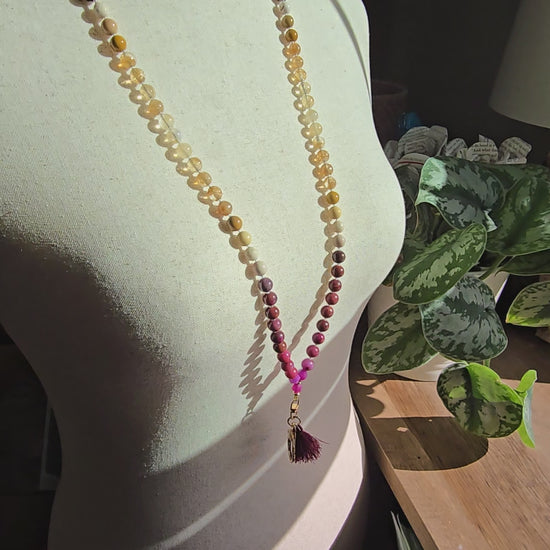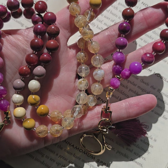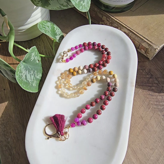 The colorful gemstone combination features sunny Citrine (for abundance and joy), grounding Mookaite (for stability and connection), vibrant Yellow Quartz, and protective Suglite. Finished with a complementary tassel, this lanyard is more than an accessory—it’s a wearable affirmation of quiet confidence.