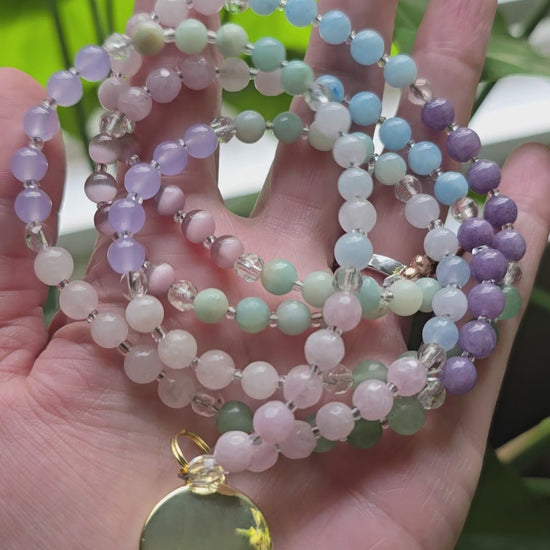 - Focal & Accent Beads: Stunning gradient blend of purple Selenite, Kunzite, Aventurine, Angelite, Amazonite, and Violet Chalcedony.